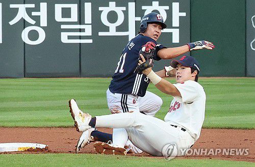1회 초 무사 1루 두산 이유찬의 삼진 때 1루 주자 정수빈이 2루 도루에 실패하고 있다. 롯데 2루수는 한태양. 2025.7.10