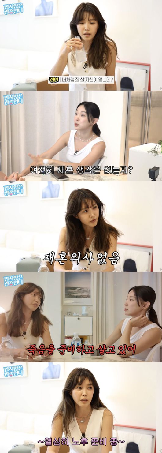 이후 이지혜는 '돌싱'인 채정안에게 "언니가 다시 결혼할 수 있는데 안하고 싱글라이프를 택했다. 아이 생각도 없어 보였다. 지금도 같은 생각이냐"고 물었다. 이에 채정안은 "너처럼 잘 살 자신이 없다. 그리고 잘 살려고 애쓰면서 살고 싶지 않다"고 속마음을 털어놨다.