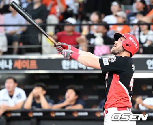 [OSEN=대전, 이대선 기자] 10일 오후 대전 한화생명볼파크에서 2025 신한 SOL Bank KBO리그 한화 이글스와 KIA 타이거즈의 경기가 열렸다. 한화는 황준서, KIA는 네일을 선발로 내세웠다. 4회초 1사 1,3루에서 KIA 위즈덤이 희생플라이를 날리고 있다. 2025.07.10 /sunday@osen.co.kr