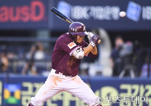 [스포츠투데이 팽현준 기자] 10일 서울 잠실야구장에서 열린 2025 KBO리그 키움 히어로즈와 LG 트윈스의 경기, 4회초 2사 1,2루 키움 이주형이 몸쪽공에 움츠리고 있다. 2025.07.10. [스포츠투데이 팽현준 기자 sports@stoo.com]
