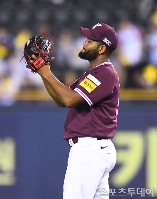 [스포츠투데이 팽현준 기자] 10일 서울 잠실야구장에서 열린 2025 KBO리그 키움 히어로즈와 LG 트윈스의 경기, 6회말 키움 알칸타라가 임지열의 호수비에 박수치고 있다. 2025.07.10. [스포츠투데이 팽현준 기자 sports@stoo.com]