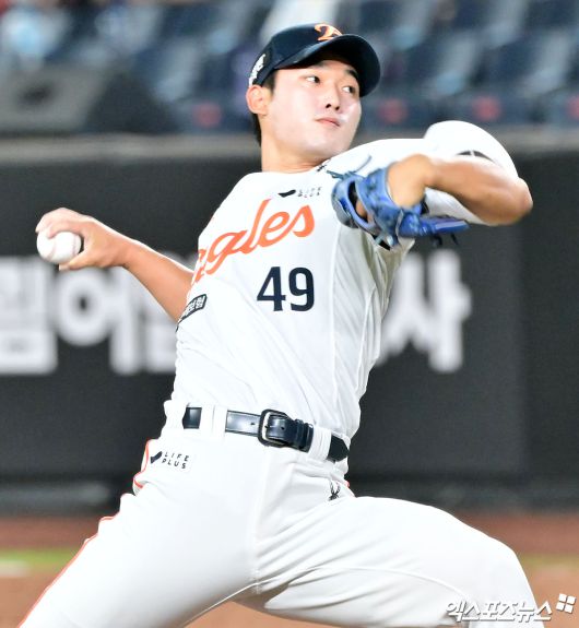 (엑스포츠뉴스 대전, 김한준 기자) 10일 오후 대전 한화생명 볼파크에서 열린 '2025 신한 SOL Bank KBO리그' KIA 타이거즈와 한화 이글스의 경기, 7회초 1사 한화 윤산흠이 공을 힘차게 던지고 있다.김한준 기자 kowel@xportsnews.com