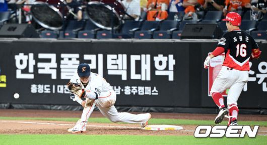 [OSEN=대전, 이대선 기자] 10일 오후 대전 한화생명볼파크에서 2025 신한 SOL Bank KBO리그 한화 이글스와 KIA 타이거즈의 경기가 열렸다. 한화는 황준서, KIA는 네일을 선발로 내세웠다. 9회초 1사에서 한화 채은성이 심우준의 악송구를 놓치고 있다. 2025.07.10 /sunday@osen.co.kr