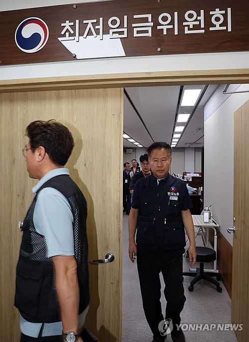 (세종=연합뉴스) 배재만 기자 = 10일 정부세종청사에서 열린 최저임금위원회 제12차 전원회의에서 민주노총 소속 근로자위원들이 최저임금 인상률에 반대하며 회의장을 떠난 뒤 남은 한국노총 근로자위원들이 정회된 회의장을 나오고 있다. 2025.7.10