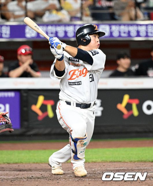 [OSEN=대전, 이대선 기자] 5회말 1사 1루에서 한화 문현빈이 중전 2루타를 치고 있다. 2025.07.08 /sunday@osen.co.kr |