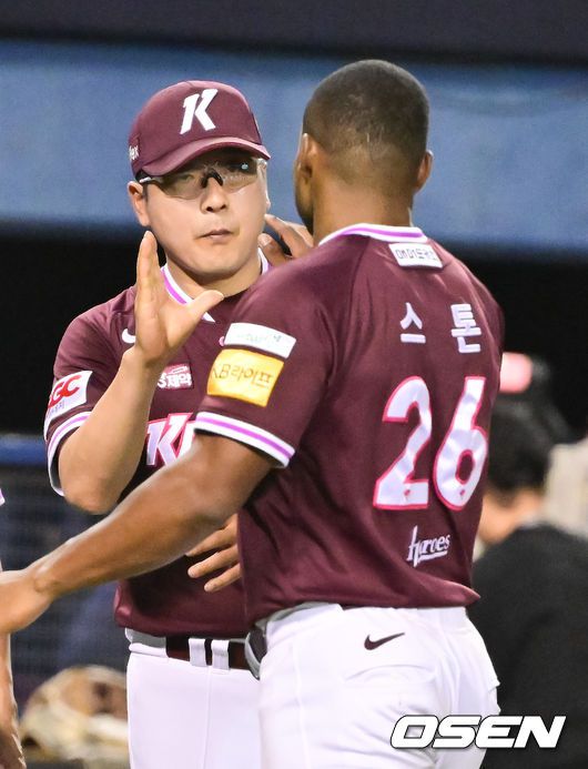 [OSEN=잠실, 박준형 기자] 프로야구 키움 히어로즈가 LG 트윈스를 꺾고 7연패에서 탈출했다. 키움은 10일 서울 잠실구장에서 열린 2025 KBO리그 LG와 경기에서 4-3으로 승리했다. 9회 2아웃에서 스톤이 결승타를 때렸다. 경기종료 후 키움 홍원기 감독이 스톤이 하이파이브를 하고 있다. 2025.07.10 / soul1014@osen.co.kr