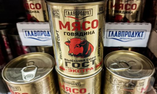 러시아의 한 슈퍼마켓에 진열된 글랍르포둑트의 쇠고기 스튜 캔. 2025.07.08. ⓒ 로이터=뉴스1 |