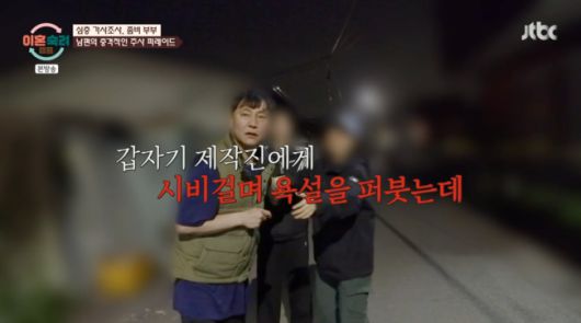 갑자기 제작진에게 시비를 걸며 욕설을 퍼부은 남편은 점점 주사가 과격해졌다. 남편은 “파란 옷 와봐. 야 이리 와봐”라며 심한 욕설을 하는 모습이 그려졌다. 점점 과격해지는 주사에 가사조사실을 충격에 빠졌다.
