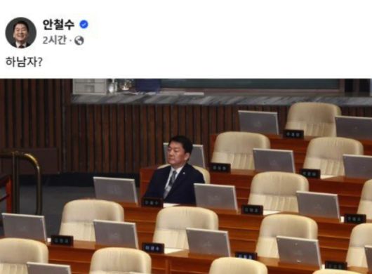 안 의원은 10일 자신의 사회관계망서비스(SNS)에 "하남자?"란 글과 함께 자신이 본회의장에 홀로 앉아있는 사진을 게시했다. 이 사진은 지난해 12월 7일 국회 본회의에서 '윤석열 대통령 탄핵소추안'이 안건으로 상정되자 국민의힘 의원들이 퇴장한 가운데 안 의원이 홀로 자리를 지키고 있었던 당시 모습이다.
