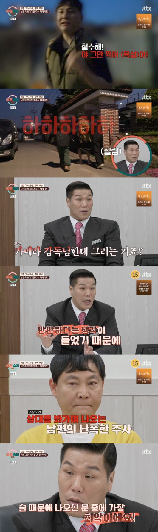 갑자기 제작진에게 시비를 걸며 욕설을 퍼부은 남편은 점점 주사가 과격해졌다. 남편은 “파란 옷 와봐. 야 이리 와봐”라며 심한 욕설을 하는 모습이 그려졌다. 점점 과격해지는 주사에 가사조사실을 충격에 빠졌다.