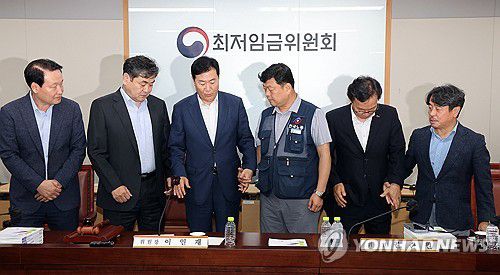 (세종=연합뉴스) 배재만 기자 = 10일 정부세종청사에서 열린 제12차 전원회의에서 내년 최저임금을 시간당 1만320원으로 17년만에 합의로 결정한 공익위원-사용자위원-근로자위원들이 기념촬영을 하고 있다. 왼쪽부터 하헌제 상임위원, 이인재 위원장, 사용자위원인 류기정 한국경영자총협회 전무, 근로자위원인 류기섭 한국노총 사무총장, 사용자위원인 이명로 중소기업중앙회 인력정책본부장, 공익위원인 권순원 숙명여대 교수. 2025.7.11