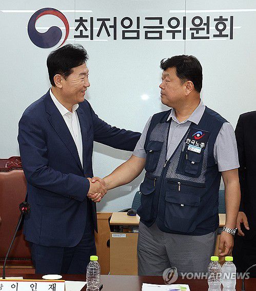 (세종=연합뉴스) 배재만 기자 = 최저임금위원회 사용자위원 운영위원인 류기정 한국경영자총협회 전무(왼쪽)와 근로자위원 운영위원인 류기섭 한국노총 사무총장이 10일 정부세종청사에서 열린 제12차 전원회의에서 내년 최저임금을 시간당 1만320원으로 17년 만에 합의로 결정한 뒤 악수하고 있다. 2025.7.11