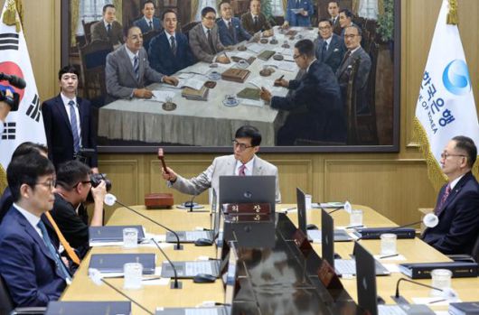 이창용 한국은행 총재가 10일 서울 중구 한국은행 본관에서 열린 금융통화위원회에서 의사봉을 두드리며 개회 선언을 하고 있다. 공동취재단 |