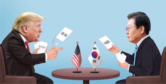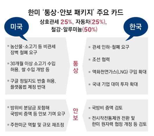 대통령실은 도널드 트럼프 대통령의 관세 서한을 받은 뒤 내부적으로 기존 대미 패키지에 국한된 협상으로는 유예 기간 내 관세협상에서 지금보다 진전을 보기 어렵다고 판단한 것으로 알려졌다. 여권 고위 관계자는 “미국은 비관세장벽을 중심으로 관세 재부과를 판단하겠다는 것”이라며 “그래서 (안보 분야를 연계한) 다른 관점을 미국에 제시했다”고 전했다. 방미 일정을 마치고 9일 귀국한 위성락 국가안보실장이 브리핑에서 “동맹의 ‘엔드 스테이트(end state·최종 상태)’까지 시야에 놓고 협상하는 게 적절하지 않겠냐”고 언급한 것도 같은 맥락이라는 분석이다.