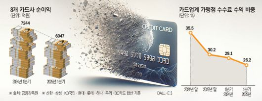 카드사의 전통 수익원인 가맹점 수수료는 이미 뚜렷한 감소세로 돌아섰다. 금융감독원에 따르면 올 1분기 전업 8개 카드사(신한·삼성·현대·KB국민·롯데·하나·우리·BC카드)의 가맹점 수수료 수익은 1조8437억 원으로 전년 동기(2조139억 원)보다 8.4% 줄었다. 전체 수익에서 가맹점 수수료가 차지하는 비중은 2021년 35.5%에서 올 1분기 26.2%로 10%포인트(p) 가까이 급감했다. 가맹점의 75%를 차지하는 연 매출 3억 원 이하 영세가맹점은 신용카드 수수료율은 0.4%까지 낮아진 상태다.