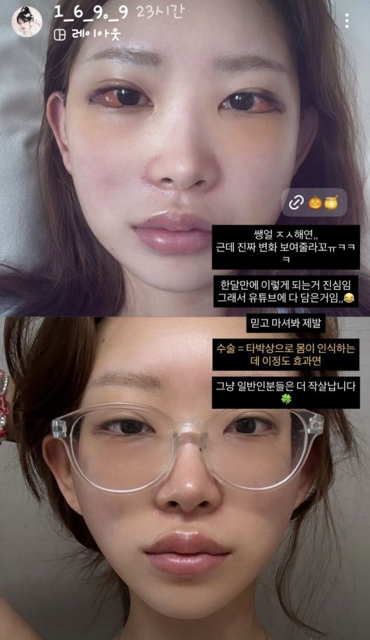 수술 직후 최준희의 얼굴은 많이 부어 있었다. 눈 흰자까지 빨갛게 부어 있는 모습이라 걱정을 자아냈다.