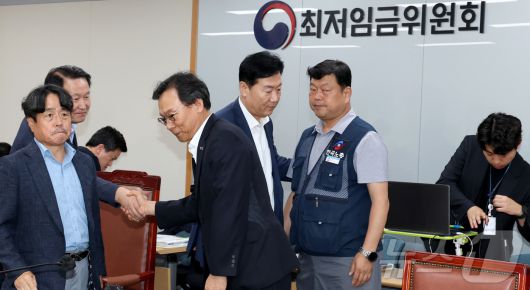 지난 10일 저녁 세종시 정부세종청사 고용노동부에서 열린 최저임금위원회 제12차 전원회의에서 사용자위원과 한국노총 근로자위원들만이 참여하여 2026년 최저임금을 10,320원으로 합의하며 류기정 사용자위원, 류기섭 근로자위원, 권순원 공익위원 등이 인사를 나누고 있다. 2025.7.11/뉴스1 ⓒ News1 김기남 기자