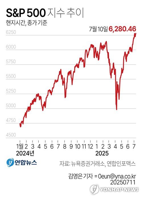 (뉴욕=연합뉴스) 이지헌 특파원 = 도널드 트럼프 미국 행정부가 고율 관세 위협을 지속함에도 불구하고 투자자들이 낙관적인 태도를 유지하면서 10일(현지시간) 뉴욕증시가 사상 최고치고 마감했다.