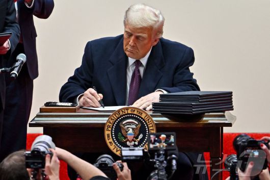 도널드 트럼프 미국 대통령이 두 번째 임기 취임 첫날인 올해 1월 20일(현지시간) 워싱턴 '캐피털원 아레나'에서 열린 제47대 대통령 취임 축하 퍼레이드에 참석해 지지자들 앞에서 행정명령에 서명하고 있다. 2025.01.21 ⓒ AFP=뉴스1 ⓒ News1 우동명 기자 |