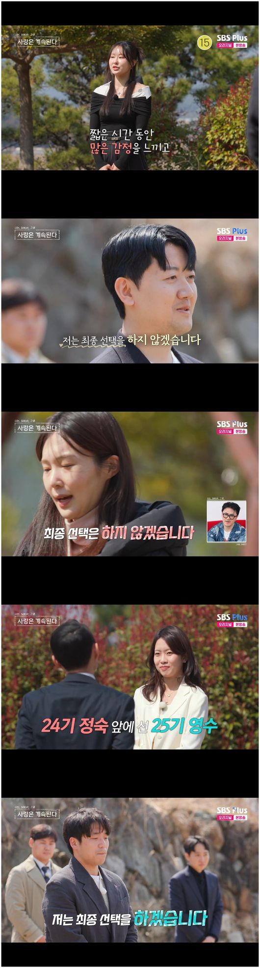 23기 영호에게 호기심이 있지만 4기 정수는 이제 거절해야 하는 6기 현숙. 현숙은 마지막 선택으로 4기 정수를 골랐다. 이는 여지를 주는 게 아니라, 유종의 미를 거두는 의식이었다.