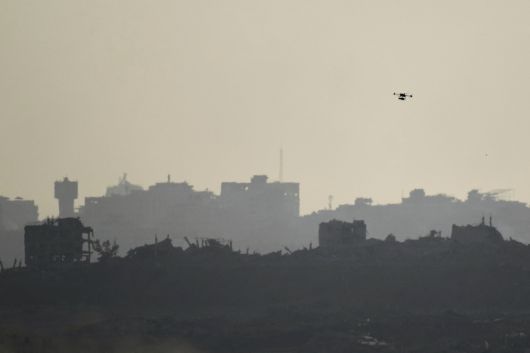 지난 8일(현지시간) 이스라엘 남부에서 바라본 가자지구 북부 상공을 드론이 비행하고 있다. AP=연합뉴스 |