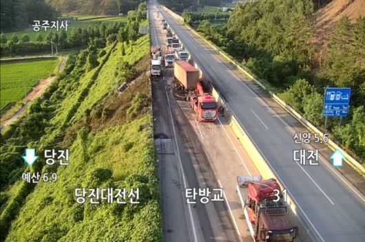[예산=뉴시스] 11일 오전 3시45분께 당진영덕고속도로 당진방향 31㎞ 지점 충남 예산군 대흥면에서 3중 추돌사고 후 불이 나 현장에 출동한 경찰과 소방대원들이 현장을 수습하고 있다. (사진-한국도로공사 CCTV 화면 갈무리) 2025.07.11. photo@newsis.com *재판매 및 DB 금지 |