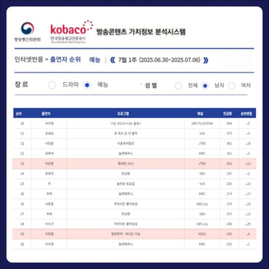 최근 방송통신위원회의 방송콘텐츠 가치정보 분석 시스템(RACOI)에 따르면, 이찬원은 2025년 7월 1주(6월 30일~7월 6일) 인터넷 반응 분석 출연자 순위에서 JTBC '톡파원 25시'로 남성 예능 출연자 13위, KBS 2TV '방판뮤직: 어디든 가요'로 19위를 기록했다.