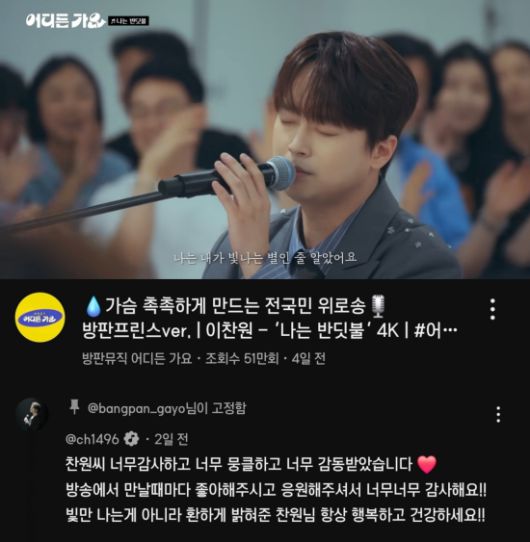 7월 10일 기준 조회수 51만 회를 넘은 커버 영상. 특히, 원곡자 황가람이 직접 댓글을 남겨 감사 인사를 전해 눈길을 끌었다.
