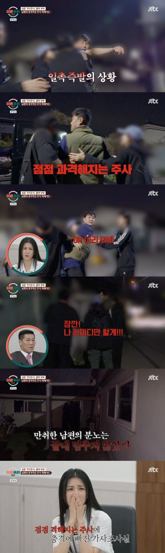 갑자기 제작진에게 시비를 걸며 욕설을 퍼부은 남편은 점점 주사가 과격해졌다. 남편은 “파란 옷 와봐. 야 이리 와봐”라며 심한 욕설을 하는 모습이 그려졌다. 점점 과격해지는 주사에 가사조사실을 충격에 빠졌다.