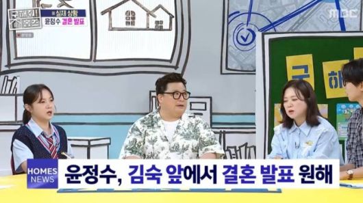 이에 김숙이 “어이가 없는 게 왜 여기서 이 짓을 하시는 거죠? 왜 여기서 이러는 건지”라고 하자 윤정수는 “온 국민의 염원이었던 김숙 씨가 있는 이곳에서 얘기를 하는 게 나을 것 같아서”라며 웃었다.