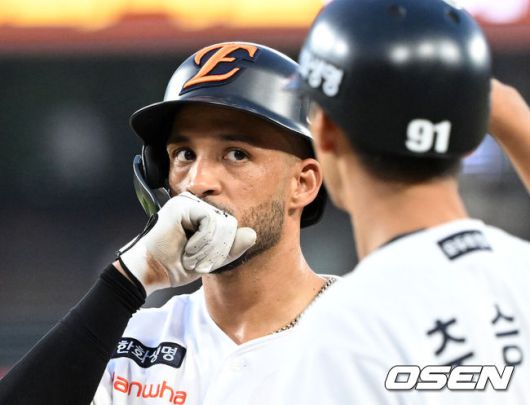[OSEN=대전, 이대선 기자] 8일 오후 대전 한화생명볼파크에서 2025 신한 SOL Bank KBO리그 한화 이글스와 KIA 타이거즈의 경기가 열렸다.한화는 문동주, KIA는 윤영철을 선발로 내세웠다.1회말 무사 2,3루에서 한화 노시환의 좌전 적시타 때 홈을 밟은 3루주자 리베라토가 더그아웃에서 환호하고 있다. 2025.07.08 /sunday@osen.co.kr |