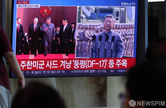 [서울=뉴스핌] 김학선 기자 = 3일 서울 중구 서울역에 설치된 TV에 중계되는 중국 전승절 열병식 행사에서 시진핑 중국 국가주석과 블라디미르 푸틴 러시아 대통령, 김정은 북한 국무위원장이 참석한 장면이 나오고 있다. 2025.09.03 yooksa@newspim.com |
