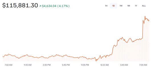 전날 사상 첫 11만2000달러를 돌파했던 비트코인은 이날도 11만3000달러를 돌파하더니 얼마 안 돼 11만6000달러 선까지 올랐다.