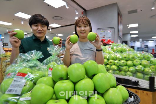 채희철(왼쪽) MD와 김시은 MD가 롯데마트 제타플렉스 잠실점 과일매장에서 ‘썸머킹 사과’를 홍보하고 있다. (사진=롯데쇼핑) |