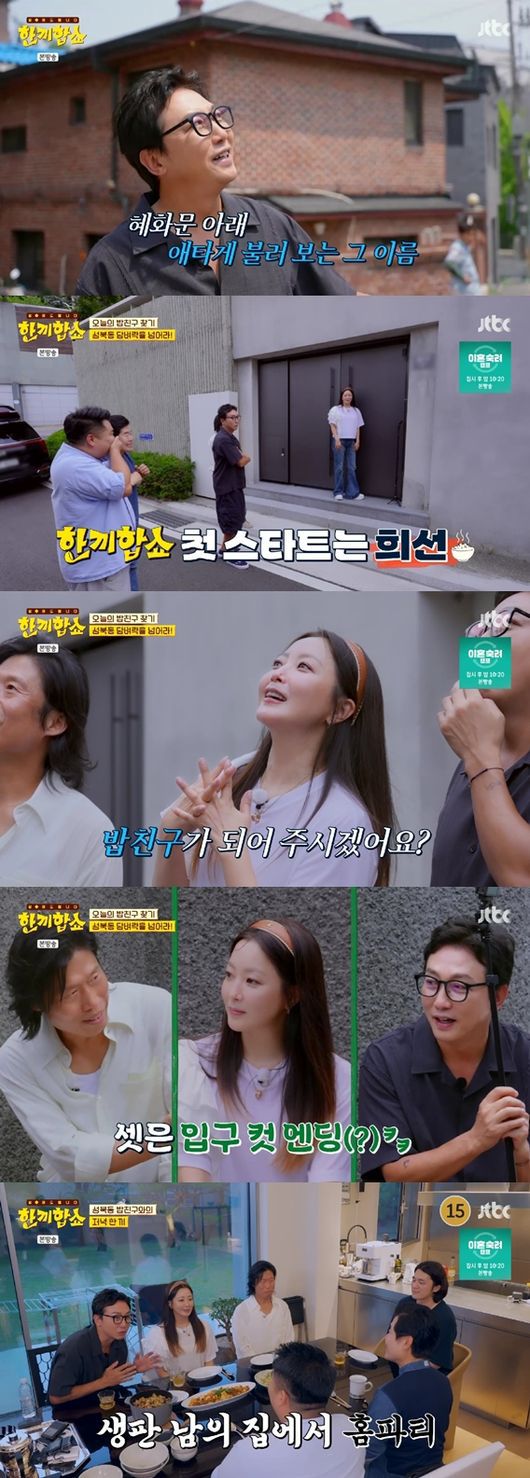10일 방송된 JTBC ‘한끼합쇼’(연출 김수진) 1회에서는 MC 김희선, 탁재훈이 동네 친구 유해진, 한 끼 셰프 이연복, 이원일과 함께 성북동을 찾아 따뜻한 한 끼에 도전하는 모습이 그려졌다. 이들은 직접 주민들과 진솔한 대화를 나누고, 식사를 대접하며 훈훈한 감동을 선사했다. 이날 방송 시청률은 닐슨코리아 유료가구 기준으로 전국과 수도권 모두 3.1%를 기록했으며 수도권에서 동시간대 1위를 차지, 첫 방송부터 제대로 통했다.