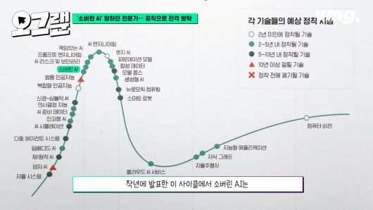 소버린 AI에 대한 사람들의 관심이 늘어나면서, 기술 혁신의 흐름을 한눈에 보여주는 가트너의 하이프 사이클에서도 그 움직임을 확인할 수 있습니다. 오그랲 첫 번째 그래프입니다.