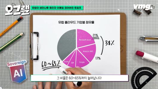 2024년을 기준으로 미국 기업들은 유럽 클라우드 시장의 60% 이상을 장악하고 있습니다. 마이크로소프트 애저가 21%로 가장 높고, 여기에 2위 아마존의 AWS까지 합치면 38%가 넘죠. 거기에 구글 클라우드, IBM, 오라클 같은 다른 미국 기업까지 더하면 그 비율은 60~65%까지 늘어납니다.