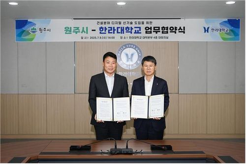 (원주=연합뉴스) 임보연 기자 = 원주시는 한라대학교와 건설 분야 디지털 신기술 도입을 위한 업무협약을 했다고 11일 밝혔다.