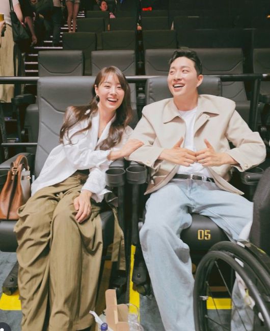 사진에는 송지은·박위 부부가 영화관 좌석에 나란히 앉아 환하게 웃고 있는 모습이 담겼다. 두 사람은 화이트 셔츠와 베이지 재킷으로 깔끔한 커플룩을 연출하며 다정한 분위기를 자아냈다.
