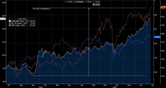그는 경기민감주 성과가 방어주를 '아웃퍼폼'하는 환경이 조성됐다며 수요는 여전히 강한 가운데 전체적으로 관련주로의 '쏠림'은 없다고 했다.