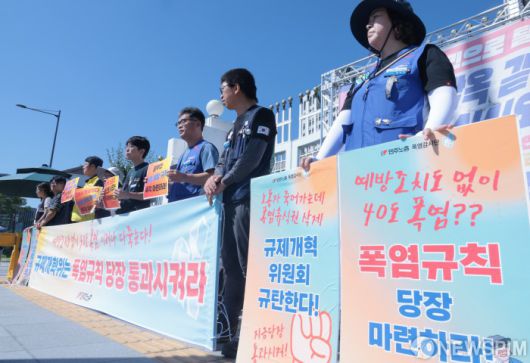 [서울=뉴스핌] 이길동 기자 =민주노총 조합원들이 11일 서울 종로구 정부서울청사 앞에서 폭염 휴식권 부정하는 규제개혁위원회 규탄, 폭염 규칙 신속 통과를 촉구하는 긴급 행동을 진행하고 있다.2025.07.11 gdlee@newspim.com