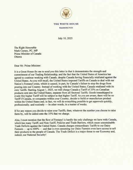 트럼프 대통령은 캐나다가 미국 제품에 대한 관세를 인상할 경우, 그 인상분만큼 미국도 35% 외에 추가로 보복 관세를 부과하겠다고 경고했다. 그러면서 "캐나다가 미국이 펜타닐 문제를 해결하는데 협조한다면 서한 내용의 변경을 검토해볼 수 있다"며 "관세는 양국 관계에 따라 바뀔 수 있다"고 덧붙였다.