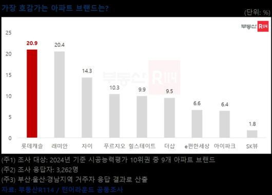 부동산R114와 턴어라운드가 공동으로 진행한 ‘2025년 아파트 브랜드 호감도’ 조사에서 롯데캐슬이 20.9%를 차지하며 부·울·경 지역 브랜드 선호도 1위를 기록했다. [출처-부동산R114] |