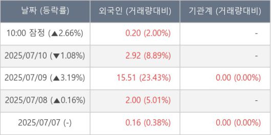[서울=뉴스핌] 로보뉴스 = 11일 10시 15분 현재 태웅로직스(124560)는 전일 대비 2.66% (현재가 3,285원) 상승했고, 외국인이 최근 7일 연속 순매수(누적 35.55만 주, 잠정) 행진을 하고 있다.