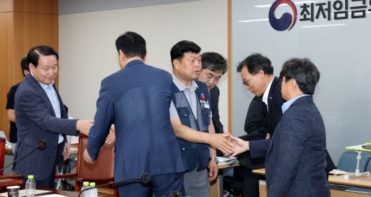 10일 저녁 세종시 정부세종청사 고용노동부에서 열린 최저임금위원회 제12차 전원회의에서 류기정 사용자위원과 류기섭 근로자위원 등이 회의장을 떠나며 인사를 나누고 있다./뉴스1 |