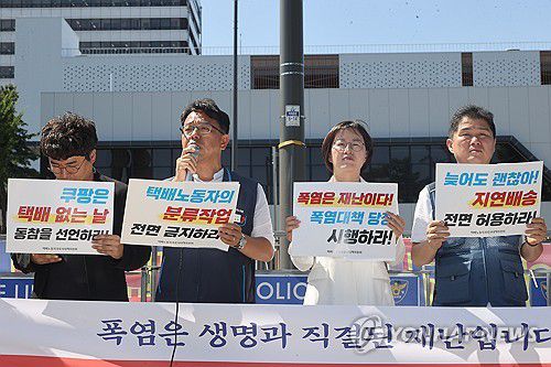 (서울=연합뉴스) 류효림 기자 = 김광창 민주노총 서비스연맹 위원장이 11일 서울 용산구 대통령실 인근에서 열린 택배노동자 긴급 폭염대책 및 택배없는 날 시행 촉구 기자회견에서 발언하고 있다. 2025.7.11