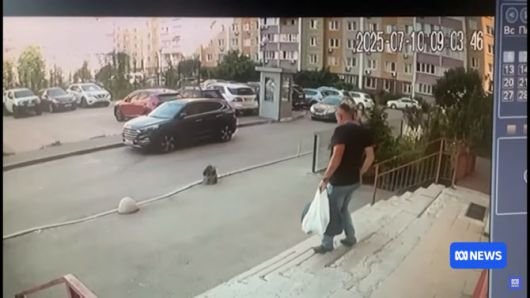 우크라이나 보안국(SBU) 소속 고위 장교가 10일(현지시간) 오전 9시 괴한의 총격을 받기 전에 건물에서 나와 차량으로 이동하고 있는 모습. (사진=호주 ABC뉴스 방송 캡처) |