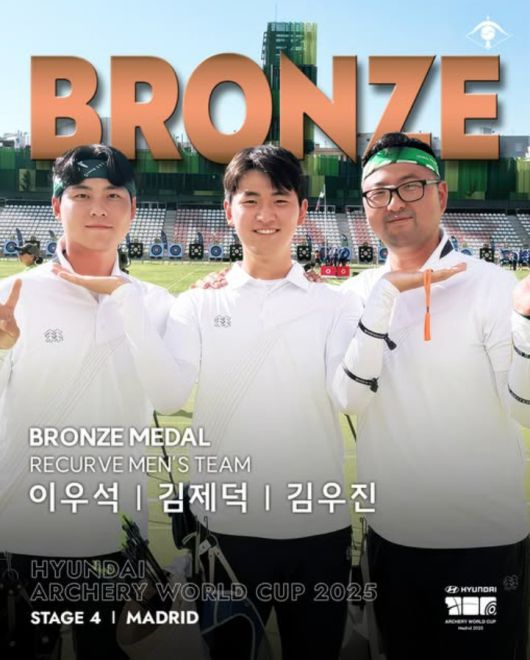 11일(현지시간) 스페인 마드리드에서 열린 2025 현대 양궁 월드컵 4차 대회 리커브 남자 단체전 동메달 결정전에서 이우석, 김제덕, 김우진으로 구성된 한국 대표팀은 일본을 상대로 침착한 경기 운영과 완벽한 호흡을 선보이며 동메달을 획득했다.