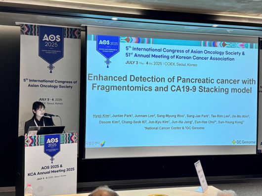 GC지놈이 지난 3일부터 4일까지 이틀간 서울 강남구 코엑스에서 열린 아시아종양학회(AOS 2025)에서 다중암 조기진단 검사 '아이캔서치'의 조기 췌장암 예측 성능을 입증한 임상 연구 결과를 발표했다.(사진=GC지놈) |