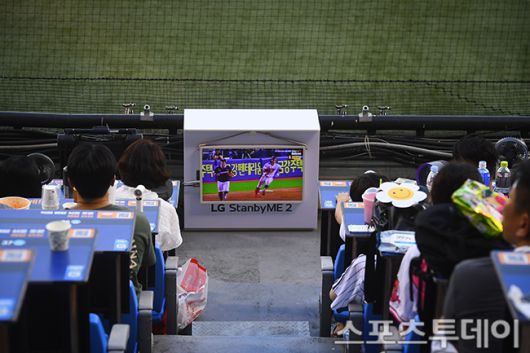[스포츠투데이 팽현준 기자] 10일 서울 잠실야구장에서 열린 2025 KBO리그 키움 히어로즈와 LG 트윈스의 경기, 테이블 관중석 앞에 중계화면이 나오고 있다. 2025.07.10. [스포츠투데이 팽현준 기자 sports@stoo.com]